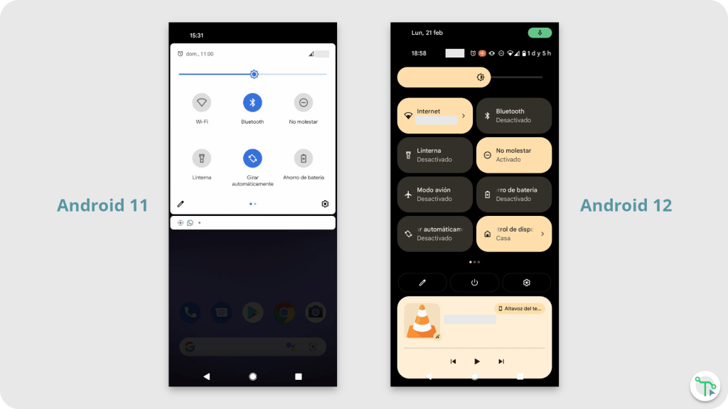 La nueva apariencia que estrena Android 12 es denominada “Material You”, que supone varios cambios en la interfaz del sistema operativo. Las esquinas redondeadas es algo que está presente por toda la interfaz. Por ejemplo, cuando accedemos a la sección de ajustes rápidos, vemos como los contornos son más pronunciados que con respecto a las versiones anteriores del sistema operativo. Desde las cajas de las notificaciones a los nuevos botones de la red, del Bluetooth, etc. (que también han cambiado su forma; desapareciendo la forma circular de anteriores versiones del sistema).