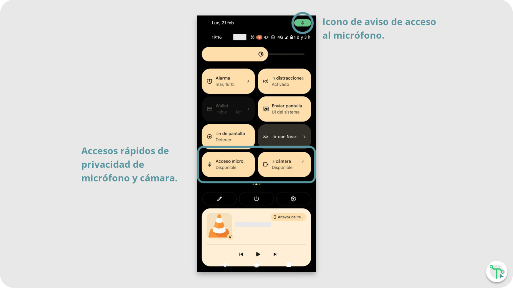 Volvamos a la sección de los ajustes rápidos. Allí vemos (deslizando una vez más hacia abajo, y luego, una vez hacia la izquierda), los nuevos accesos rápidos para activar o desactivar el micrófono o la cámara. Con estos accesos, si lo desactivamos, nunca ninguna aplicación (aunque tenga derecho) podrá usarlos. Esto nos permite usar el dispositivo durante ese tiempo con más privacidad en esos aspectos.