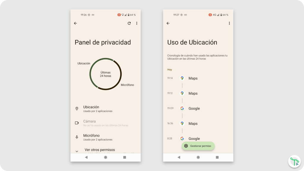 Por último, para tener un mayor control de la privacidad en las aplicaciones día a día, podemos usar el nuevo Panel de Privacidad (accediendo desde la aplicación Ajustes, en el apartado Privacidad). Aquí por medio de un gráfico, podemos ver cuánto tiempo en las últimas 24 horas se han dedicado en cada aspecto (la ubicación, la cámara, micrófono, etc.), y más abajo, podemos filtrar para ver un historial según la aplicación que lo ha usado, y gestionar que aplicaciones podrá o no usarlo.