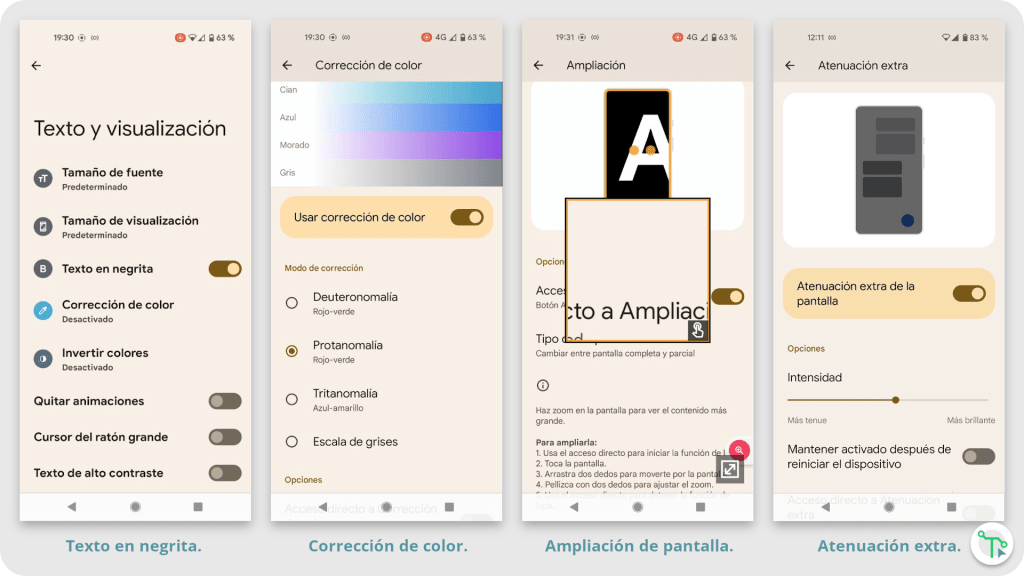- En Texto y visualización, podemos ahora conseguir que toda la interfaz y las aplicaciones tomen el texto en negrita, y corregir el color de la pantalla con diferentes modos (Deuteronomalía, escalas de grises, etc.).
