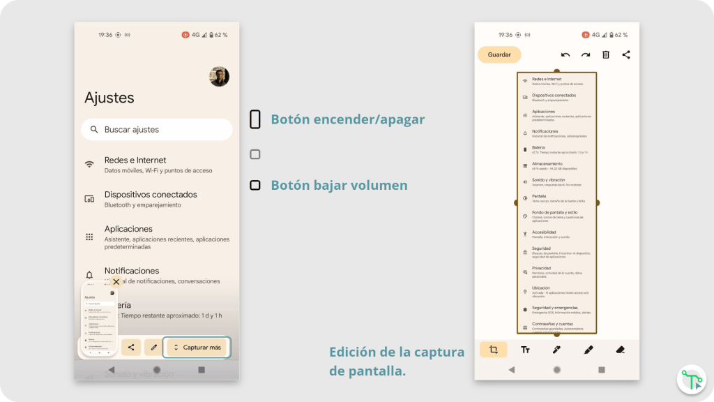 Una característica muy útil que ha sido mejorada es la herramienta de captura de pantalla con la opción de captura continua. Para acceder a esta nueva función, tenemos que accionar a la vez los botones físicos de apagar pantalla y bajar volumen.