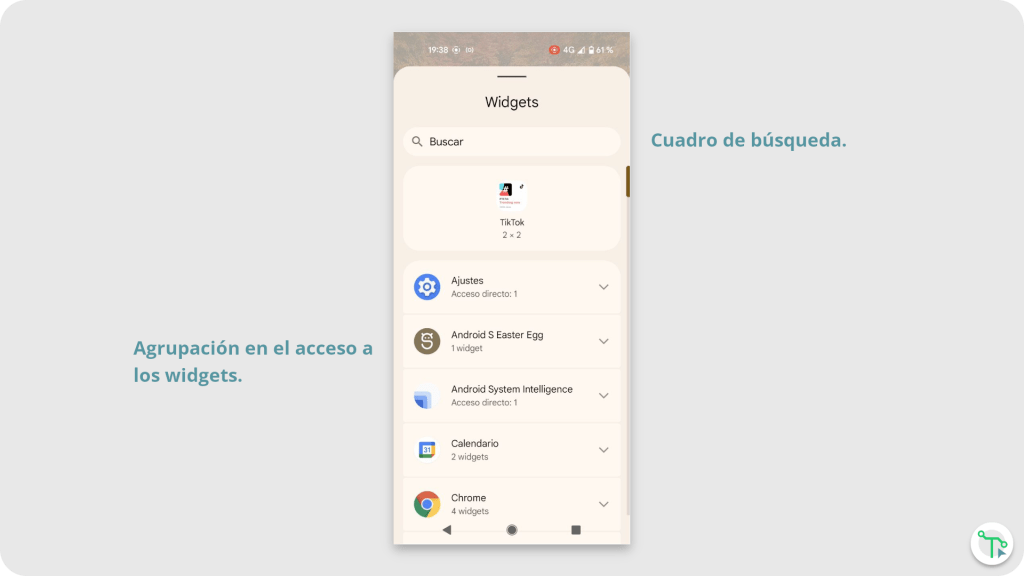 Y, por último, otra utilidad que ha mejorado su desempeño y estilo son los widgets. A la hora de acceder a ellos (haciendo una pulsación larga en la pantalla de inicio), veremos el nuevo diseño que incorpora. Ahora los widgets se agrupan en un desplegable según la aplicación que la provea. Arriba vemos un cuadro de búsqueda, donde podemos encontrar más fácilmente el que queremos añadir. Para añadir el que queramos, mantenemos pulsado en uno y lo posicionamos en la pantalla de inicio. Después, podremos cambiar el tamaño con los puntos que incorpora.