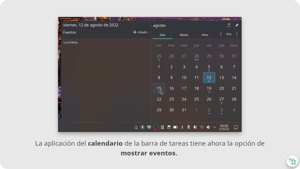 - La aplicación del calendario de la barra de tareas tiene ahora la opción de mostrar eventos.