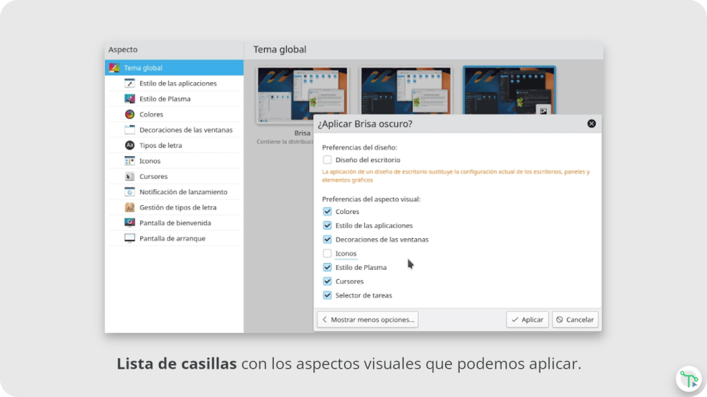 Hay varias mejoras y nuevas funciones cuando personalizamos la interfaz de Plasma en esta nueva versión. Por ejemplo, cuando accedemos a la sección “Aspecto” de la aplicación “Preferencias del sistema” y aplicamos un tema global a la interfaz, podemos elegir cómo queremos que se aplique el aspecto visual. Es decir, ahora podemos decidir qué aspectos del tema global (que cambia muchos aspectos de la interfaz) se aplican de una manera más específica.