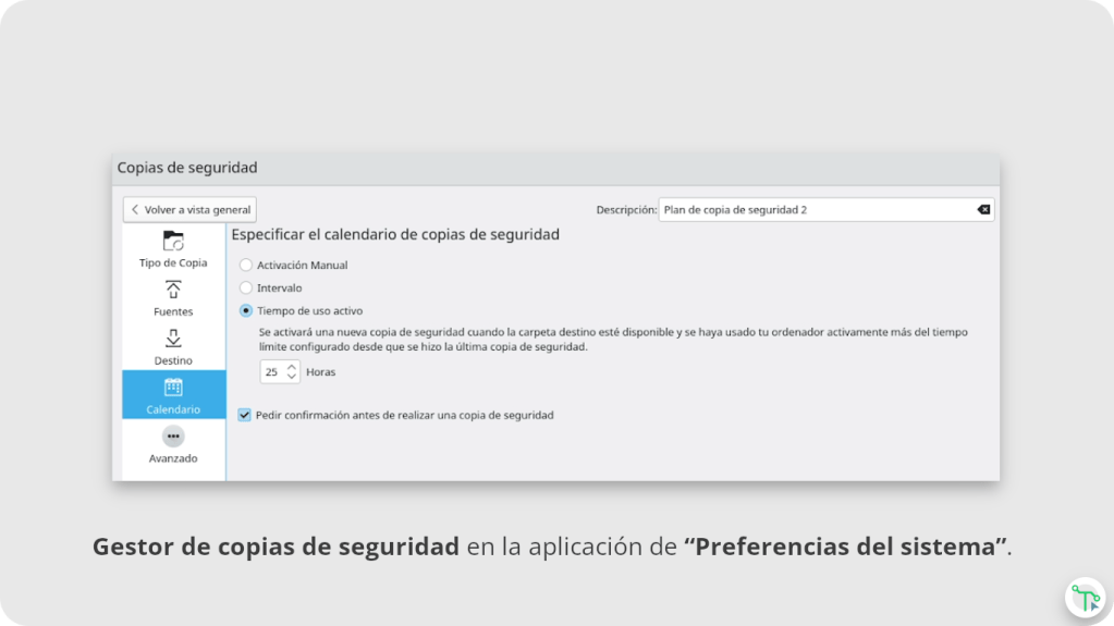 - Gestor de copias de seguridad en la aplicación de “Preferencias del sistema”.