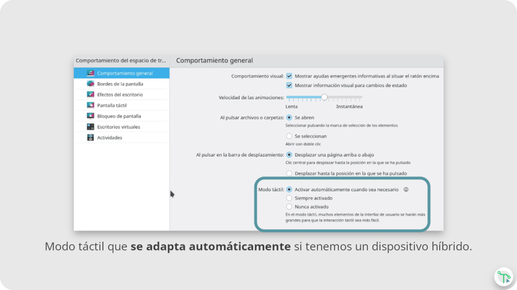 Además, si estamos usando una pantalla táctil y queremos que los controles de la interfaz se adapten mejor a nuestros dedos, podemos activar el modo táctil, que se encuentra en el apartado “Comportamiento general” de la sección “Accesibilidad” de la aplicación de “Preferencias del sistema”. Además, podemos hacer que se active automáticamente, si tenemos un dispositivo híbrido (que contiene una pantalla que se permite desacoplar del teclado y podamos usarla como una tablet). Por tanto, es una funcionalidad muy útil para estos tipos de dispositivos.