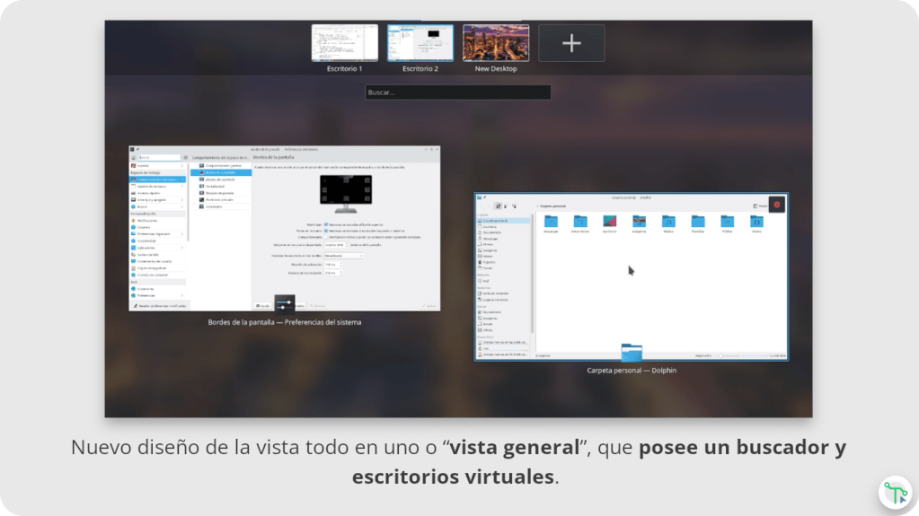 - Nuevo diseño de la vista todo en uno o “vista general”, que posee un buscador y escritorios virtuales.