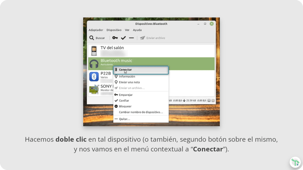 - Una vez que hayamos localizado nuestro dispositivo a emparejar, hacemos doble clic en tal dispositivo (o también, segundo botón sobre el mismo, y nos vamos en el menú contextual a “Conectar”). Si todo sale bien, veremos un mensaje de “¡Éxito!” en la parte inferior izquierda y una notificación emergente de “Dispositivo conectado”. Ya tenemos conectado y emparejado nuestros auriculares.