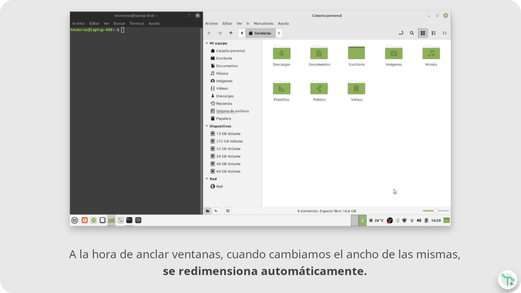 Además, hay más funciones. Por ejemplo, a la hora de anclar ventanas, cuando cambiamos el ancho de las mismas, se redimensiona automáticamente; función muy útil, ya que hace que el trabajo con ventanas sea más eficiente.