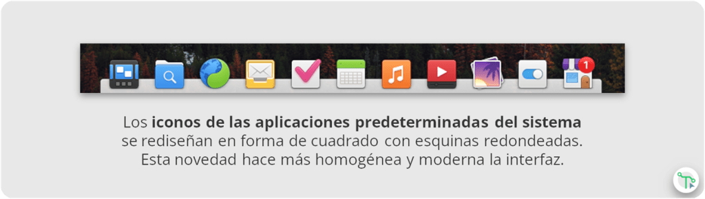 En cuanto ya tenemos iniciada la sesión, vemos su interfaz, denominada “Panteón”. Uno de los cambios está en la parte de abajo, es decir, en el muelle de aplicaciones ancladas, sobre todo, aquellas que son predeterminadas del sistema. Observamos que todas mantienen un diseño parecido, un diseño con forma de cuadrado con esquinas redondeadas, que hacen que la interfaz se muestre más homogénea y moderna.