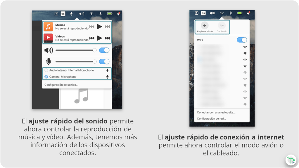 Otra de sus novedades está escondida a nuestros ojos, se encuentra en los ajustes rápidos del sistema, que se encuentran en la parte superior y derecha del escritorio. Más concretamente, una de sus novedades está en el ajuste del sonido, que ahora permite controlar la reproducción de música y vídeo desde el mismo lugar. Además, tenemos disponible más información de los dispositivos conectados (altavoces, micrófonos, etc.). Y en el ajuste rápido de conexión a internet también encontramos otra novedad, esta es un acceso rápido para el modo avión y al cableado.