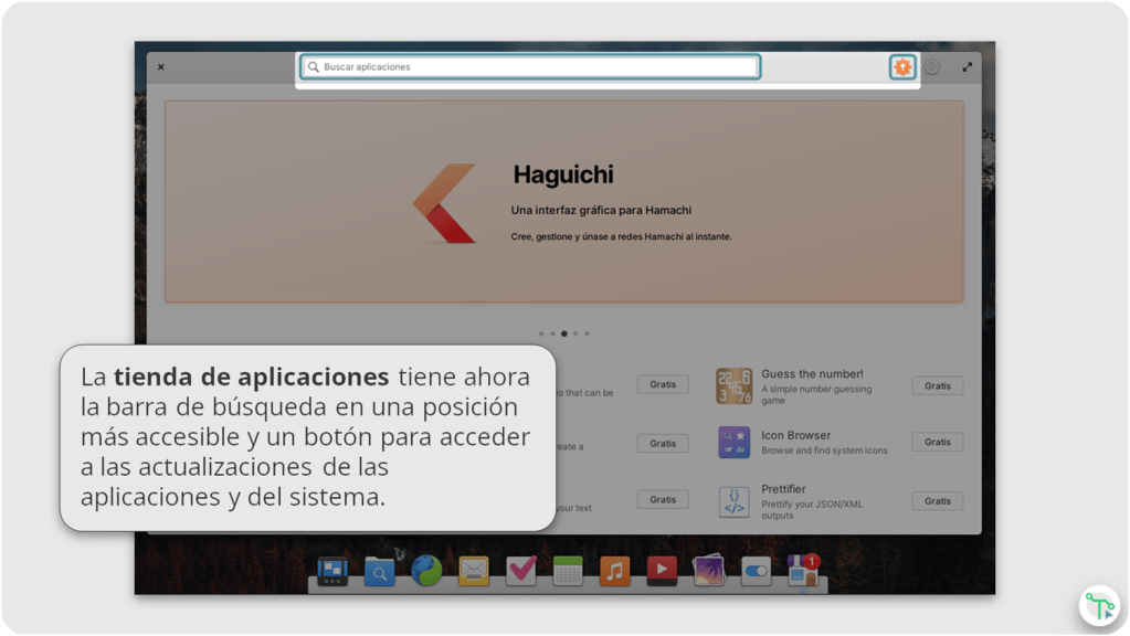 Otra aplicación que se ha renovado es la de software, es decir, la tienda de aplicaciones. Al abrirla, vemos que su barra de búsqueda está ahora en una posición más accesible, y vemos también, en la parte superior derecha, un nuevo botón con un icono de «flecha hacia arriba» que nos permite acceder a las actualizaciones de las aplicaciones y el sistema.