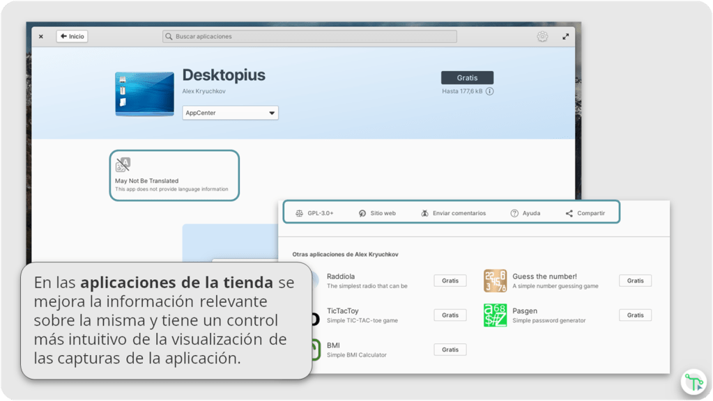 Al abrir una aplicación de la tienda, vemos que se ha mejorado la información relevante sobre la misma y que es más intuitivo el control de visualización de las capturas de pantalla de la aplicación.