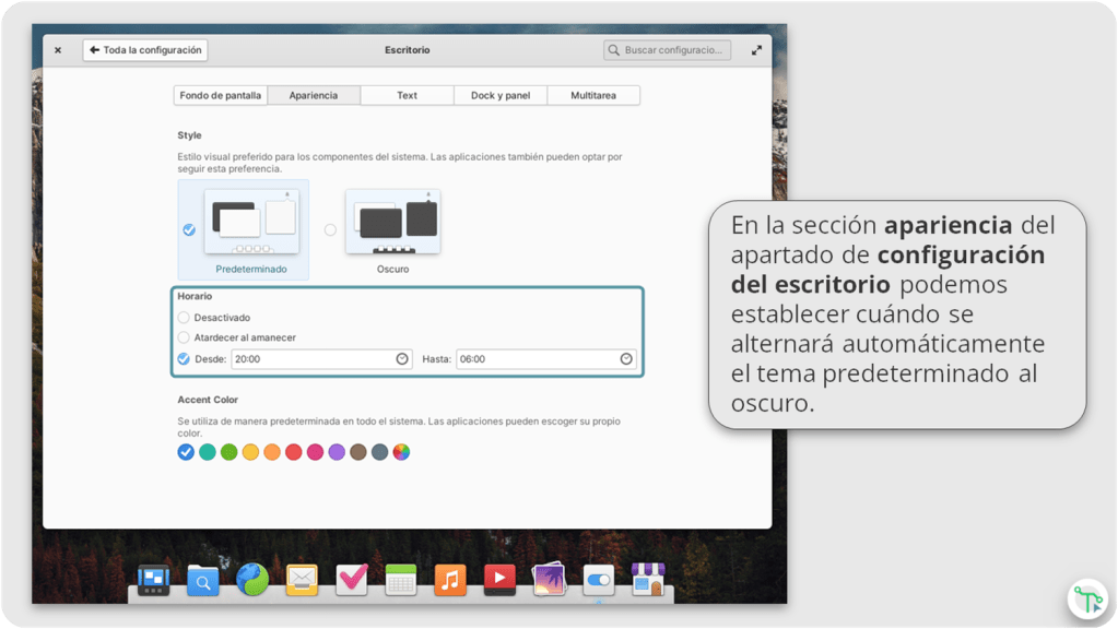 La aplicación de configuración mejora en varios de sus apartados. Una de las nuevas funciones destacadas está en la sección apariencia del apartado configuración del escritorio, donde ahora se puede alternar el tema predeterminado al oscuro automáticamente de dos maneras: