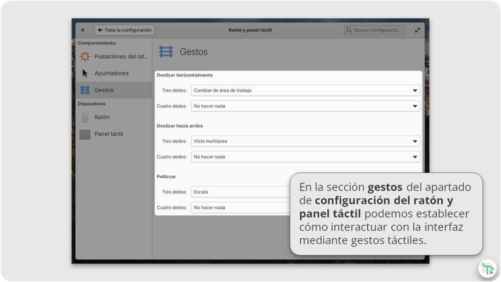 Otra de las funciones destacadas está el control de la interfaz mediante gestos, que podemos acceder desde la sección gestos del apartado de configuración del ratón y panel táctil. Es decir, podemos realizar varias acciones: