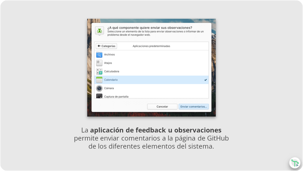 Y la última aplicación que vamos a comentar es la de feedback u observaciones. Podemos acceder a ella desde el acceso a «aplicaciones» en la parte superior izquierda del escritorio. Esta aplicación nos permite enviar comentarios a la página de GitHub de los diferentes elementos del sistema. Por tanto, es una aplicación muy interesante, ya que consigue que los diferentes elementos del sistema estén libres de errores y a las necesidades de quienes los usan.