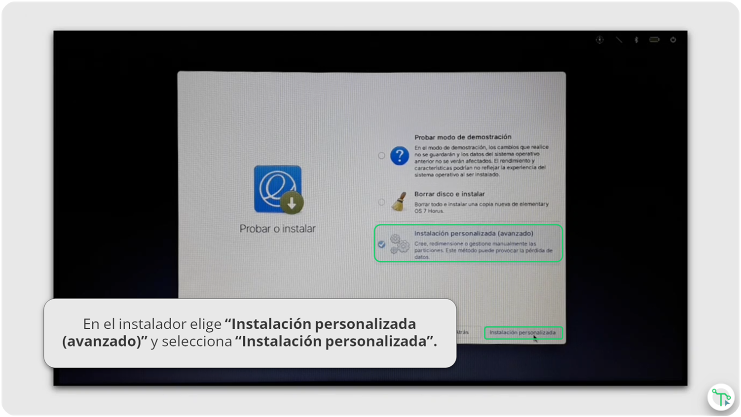 - Elige “Instalación personalizada (avanzado)” y selecciona “Instalación personalizada”.